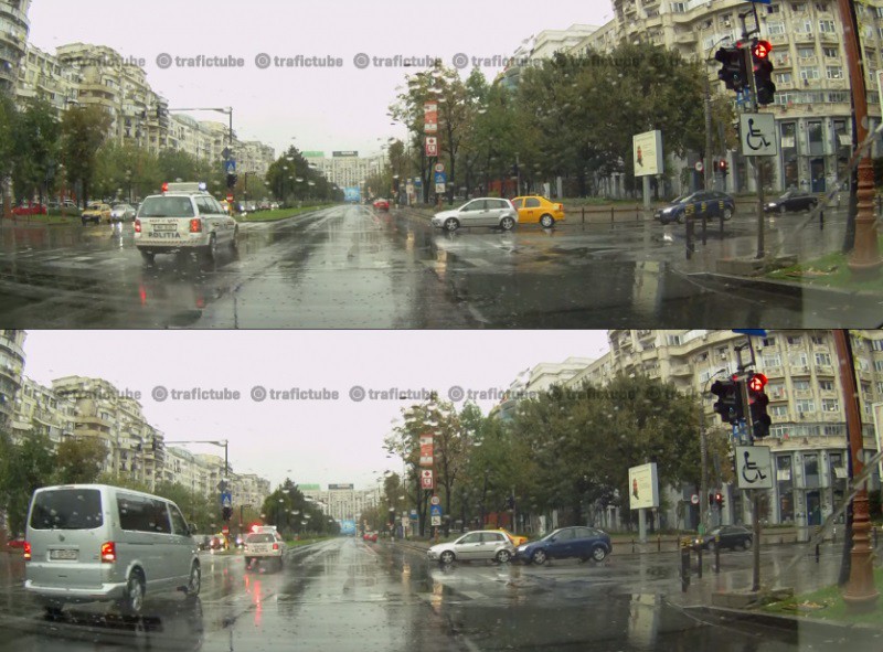 În timp ce mașina Poliției Rutiere și microbuzul gri trec, toate celelalte mașini așteaptă la semafor.