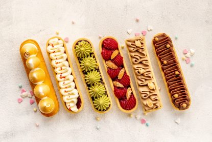Eclerele cu ciocolată sunt alte deserturi franțuzești iubite la nivel global, datorită gustului lor delicios și aspectului mai mult decât apetisant. Eclerele cu ciocolată sunt o formă de aluat pentru choux, umplute cu cremă și acoperite cu glazură de ciocolată. Desigur, în prezent, aceste delicii vin cu cele mai variate filling-uri și glazuri, cu un aspect estetic încântător. Știm că deja ți-am făcut poftă, așa că-ți poți comanda de îndată eclere de la Chocolat, în cele mai delicioase sortimente!