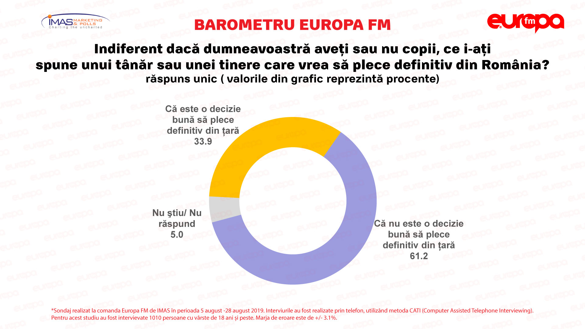 Barometru Europa FM, realizat de IMAS, la comanda postului de radio Europa FM, a căutat să afle care este percepția publică asupra motivelor pentru care unii tineri aleg să părăsească România.