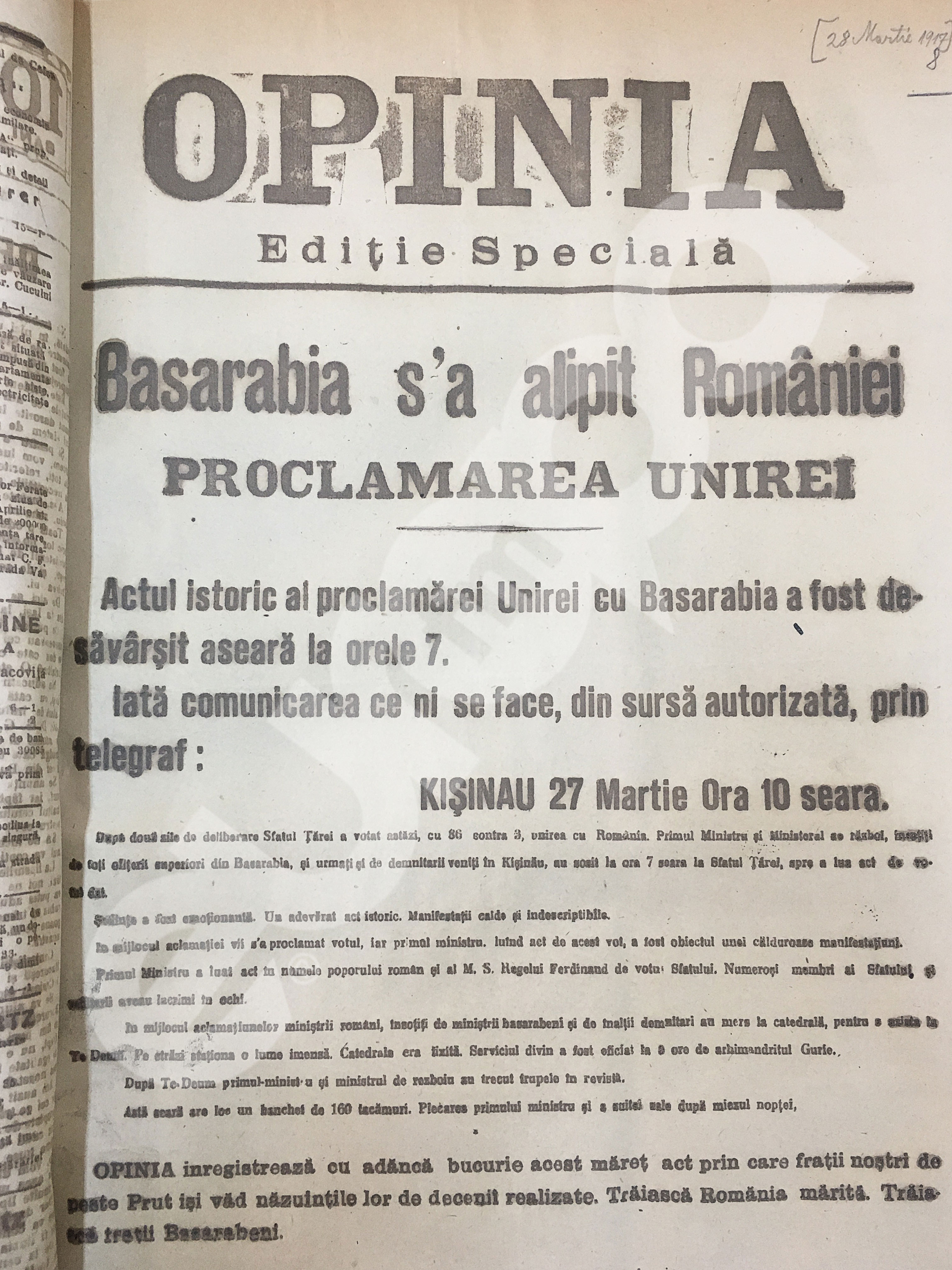 “După două zile de deliberare Sfatul Ţărei a votat astăzi, cu 86 contra 3, unirea cu România. Primul Ministru şi Ministrul de război, însoţiţi de toţi ofiţerii superiori din Basarabia, şi urmaţi şi de demnitarii veniţi în Kişinău, au sosit la ora 7 seara la Sfatul Ţărei, spre a lua act de votul dat.