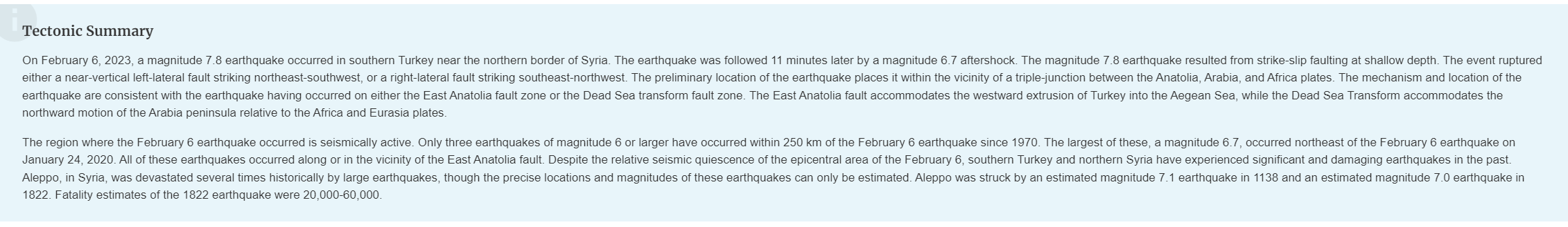 „La data de 6 februarie 2023, un cutremur cu magnitudinea 7,8 s-a produs în sudul Turciei, în apropiere de granița nordică a Siriei. Cutremurul a fost urmat, 11 minute mai târziu, de o replică cu magnitudine 6,7”, scrie US Geological Survey.