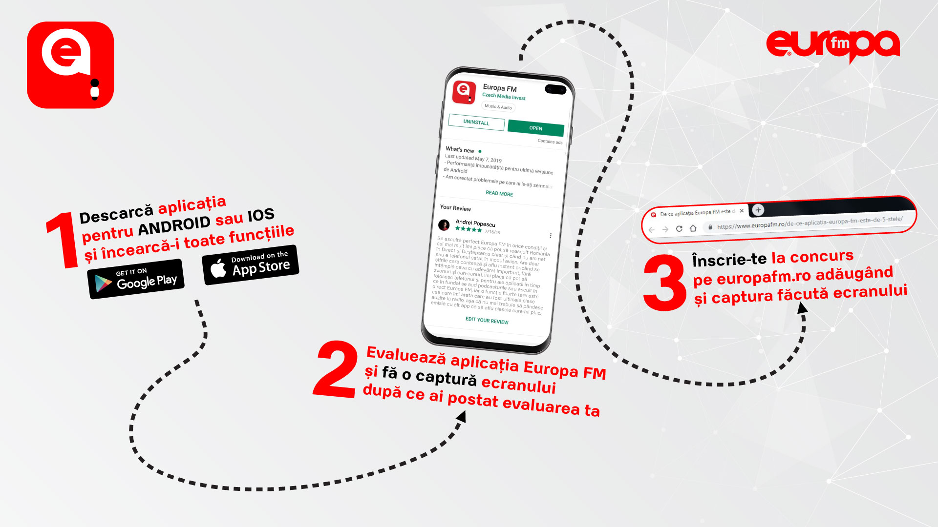 Pentru a lua parte la concurs, descarcă aplicația gratuita oficiala Europa FM (Aplicația Europa FM pentru Android / Aplicația Europa FM pentru IOS ) dă-i evaluarea ta și scrie în comentariul din magazinul GooglePlay sau AppStore ce apreciazi la aplicația Europa FM! Toate evaluările publice însoțite de un comentariu intră săptămânal în tragerile la sorți.