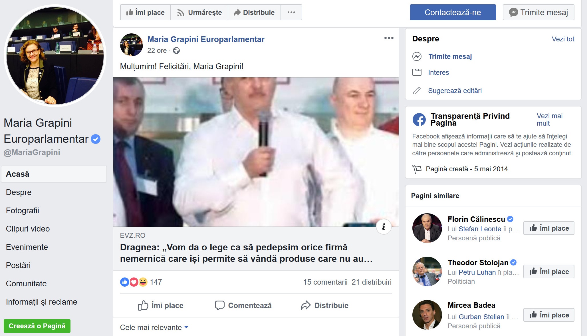 ”Mulțumim! Felicitări, Maria Grapini!” este modul în care europarlamentarul Maria Grapini a ales să distribuie o știre EVZ care citează o alta de la hotnews.ro, în care se precizează că ”Dragnea a avut numai cuvinte de laudă la adresa europarlamentarului Maria Grapini, care s-a bătut în Parlamentul European pentru România”.