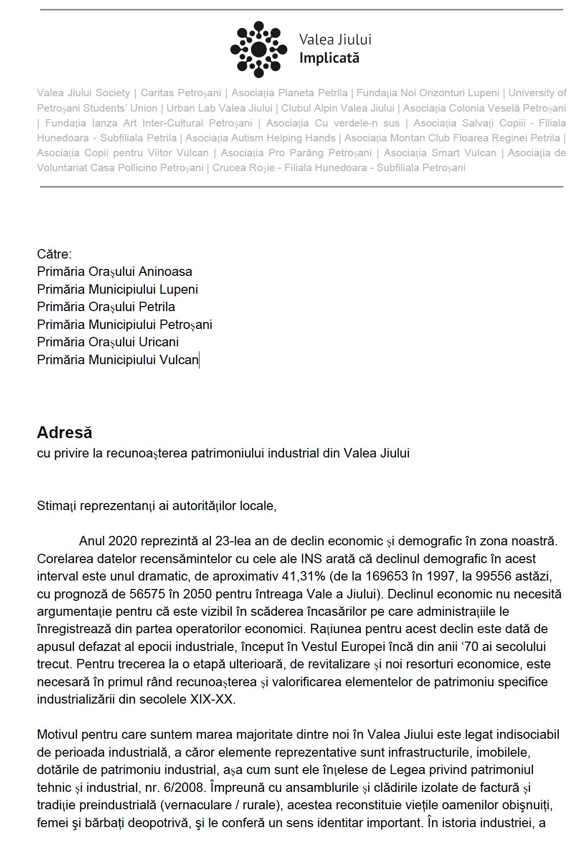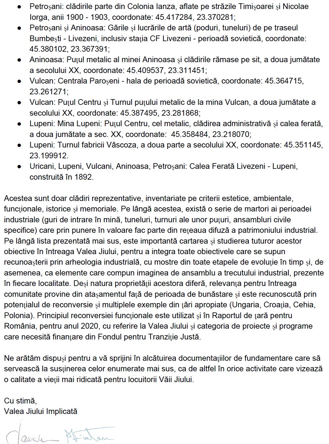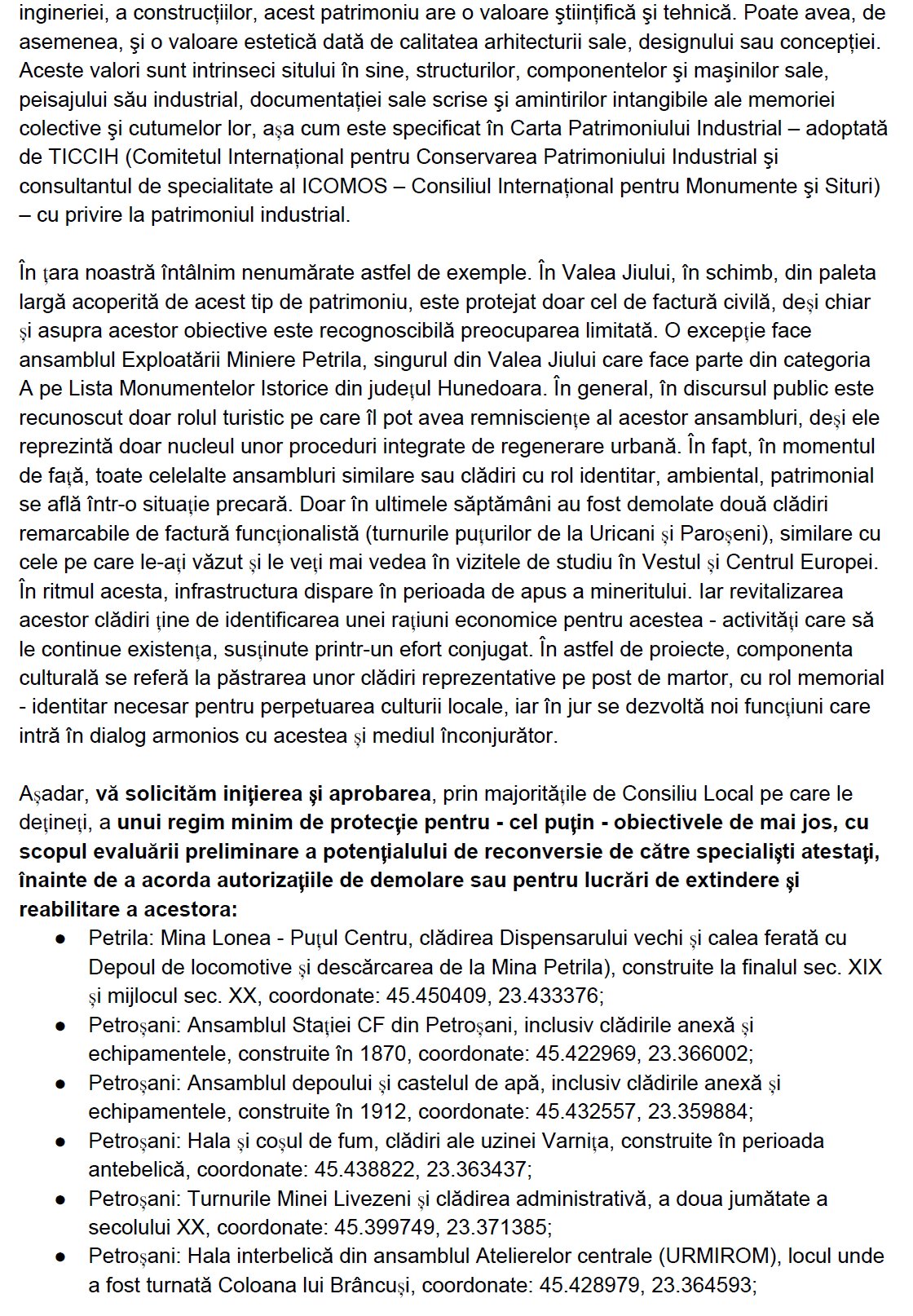 ”Așa cum veți regăsi în scrisoarea noastră de solicitare, solicităm instituirea de către autoritățile din Valea Jiului a unui regim minim de protecție pentru o listă de obiective enumerate în scrisoare, indiferent de natura proprietății acestora, cu scopul evaluării potențialului de reconversie al acestora de către specialiști atestați, înaintea acordării autorizațiilor de demolare sau modificare.