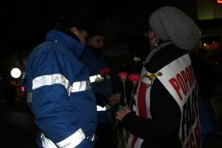 Mai multe fete au oferit flori jandarmilor, mulţumindu-le că sunt alături de ei, în vreme ce 3 toboşari bat ritmul scandărilor.