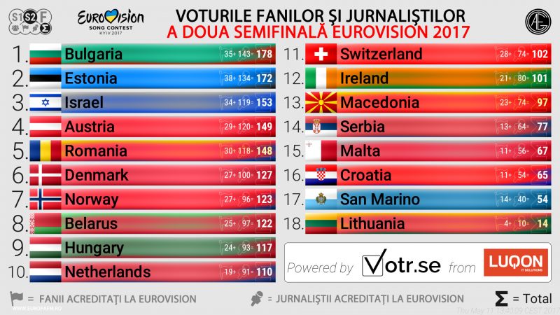 Ei se vor alătura celorlalte 6 țări calificate automat în finala de sâmbătă, precum și celor 10 reprezentanți care au avansat din prima semifinală. Mai jos puteți revedea o recapitulare a finaliștilor din prima semifinală.