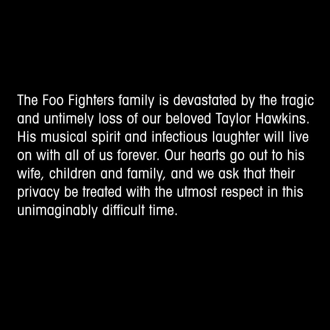 “Familia Foo Fighters este devastată de pierderea tragică și prematură a iubitului nostru Taylor Hawkins. Spiritul său muzical și râsul molipsitor vor rămâne cu noi toți pentru totdeauna. Inimile noastre sunt alături de soția, copiii și familia lui și cerem ca intimitatea lor să fie tratată cu cel mai mare respect în această perioadă dificilă dificil”, se precizează într-un comunicat.