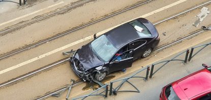 Accident pe șoseaua Mihai Bravu: O mașină a rupt gardul de delimitare și a ajuns pe liniile de tramvai