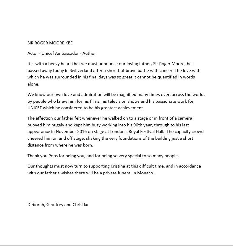 Familia lui Roger Moore a confirmat decesul artistului prin intermediul unui mesaj publicat pe Twitter.