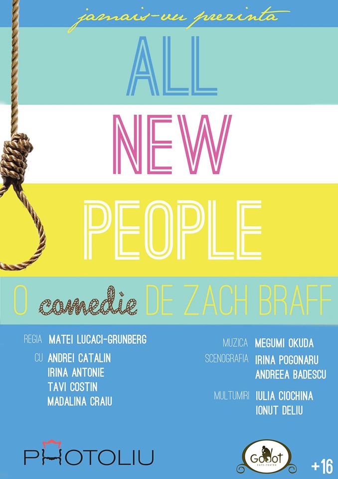 O comedie neagră despre singurătatea în mulțime. ”All New People” (de Zach Braff – regizor, actor, dramaturg şi scenarist cunoscut pentru filmul Garden State şi serialul Scrubs) spune povestea a patru oameni care în ciuda diferențelor care îi separă caută cu toții același lucru: un contact uman real. Construit în jurul unei situații-criză, spectacolul găsește umorul acolo unde aparent umorul nu are ce să caute, confruntând obsesiv spectatorul cu întrebarea: Dacă suntem cu toții singuri, atunci de ce să nu fim singuri împreună? GODOT CAFE TEATRU
