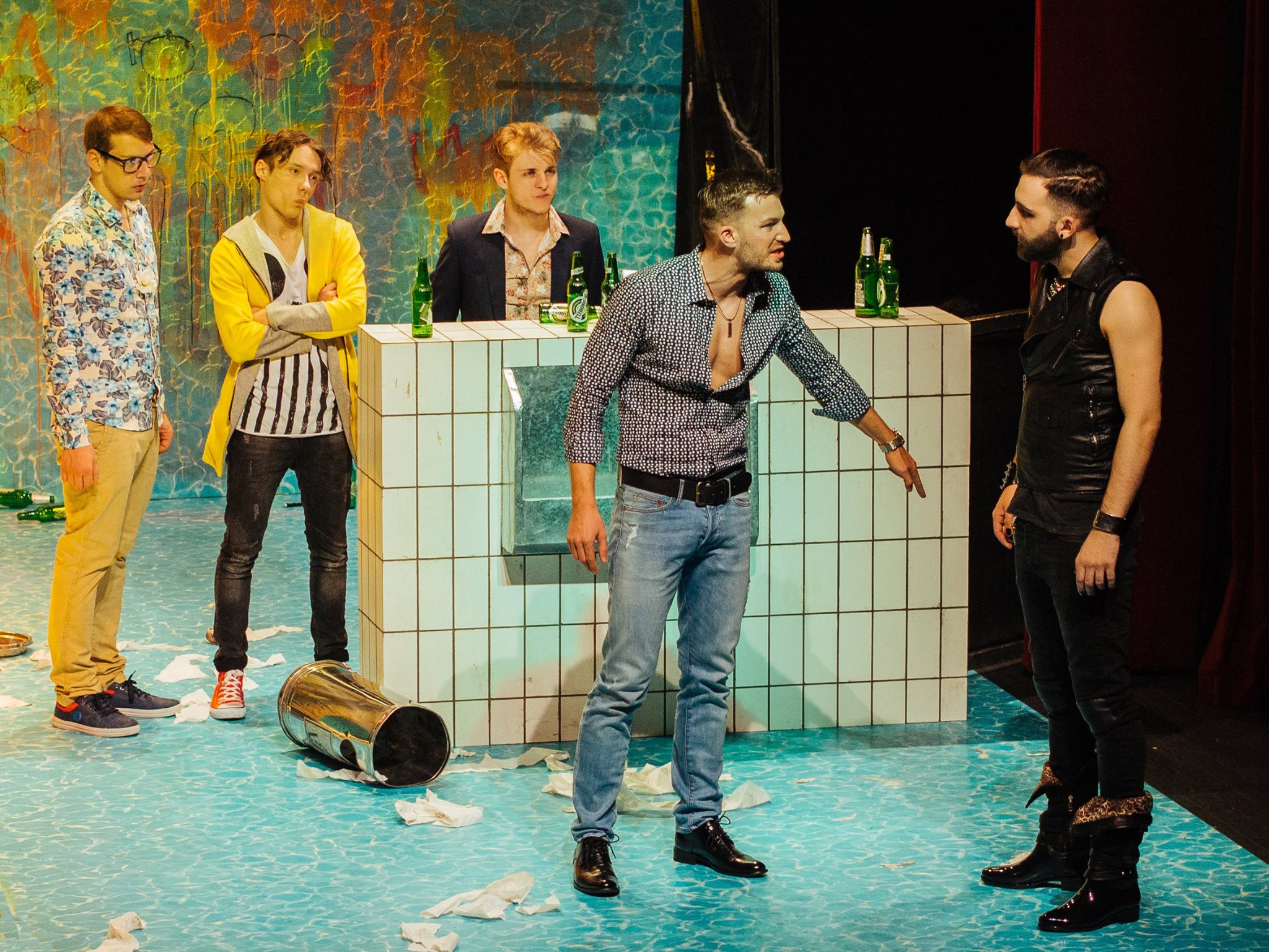 Foto 2: Tavi Costin alături de Andrei Catalin, Vlad Birzanu, Andrei Brădean, Olimpiu Blaj , în timpul repetițiilor pentru spectacolul ”FEMEI/ BĂRBAȚI”, Teatrul Anton Pann, Râmnicu Vâlcea.