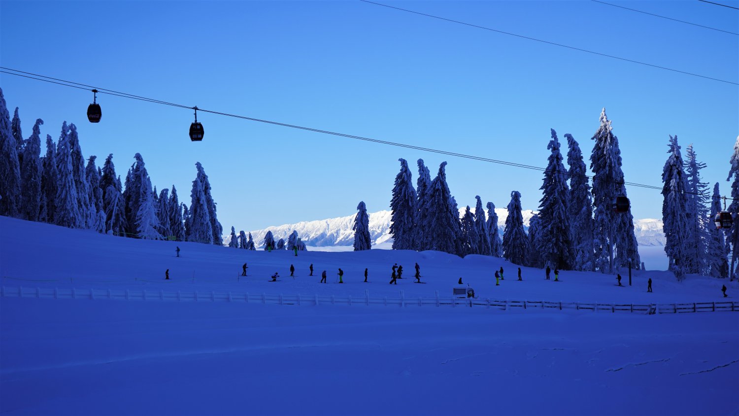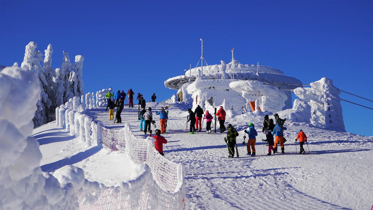 În prag de Bobotează, în Poiana Brașov au fost în această dimineață -16 grade Celsius, iar gerul a făcut ca zăpada să se fixeze pe orice obiect a întâlnit, astfel încât toate construcțiile din masivul Postăvarul par acum sculptate în gheață și modelate din zăpadă.