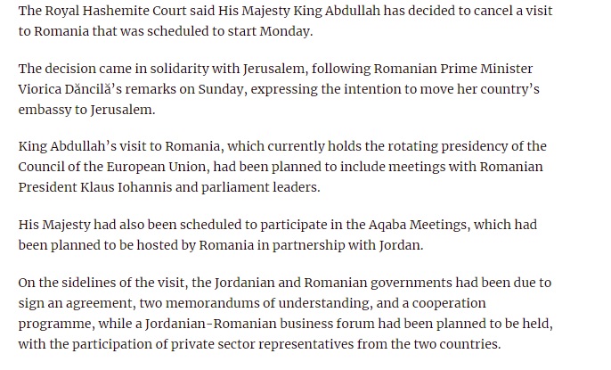 Unul dintre efectele anunţului Vioricăi Dăncilă privind mutarea Ambasadei României de la Tel Aviv la Ierusalim este anularea vizitei în România a Regelui Abdullah al II-lea al Regatului Haşemit al Iordaniei.