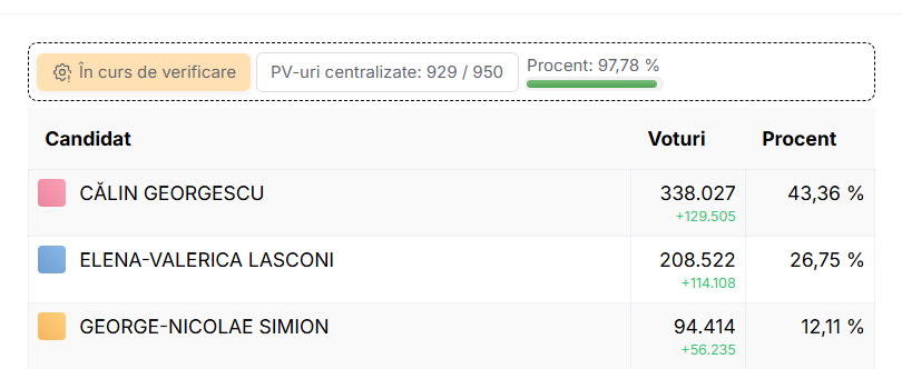- Călin Georgescu: 338.027 voturi – 43,36%