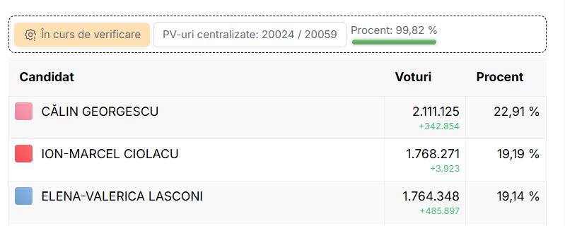ALEGERI PREZIDENȚIALE 2024, TURUL I. Rezultate ora 08:00: Călin Georgescu – 22,91%. Marcel Ciolacu – 19,19%. Elena Lasconi: 19,14% | FOTO