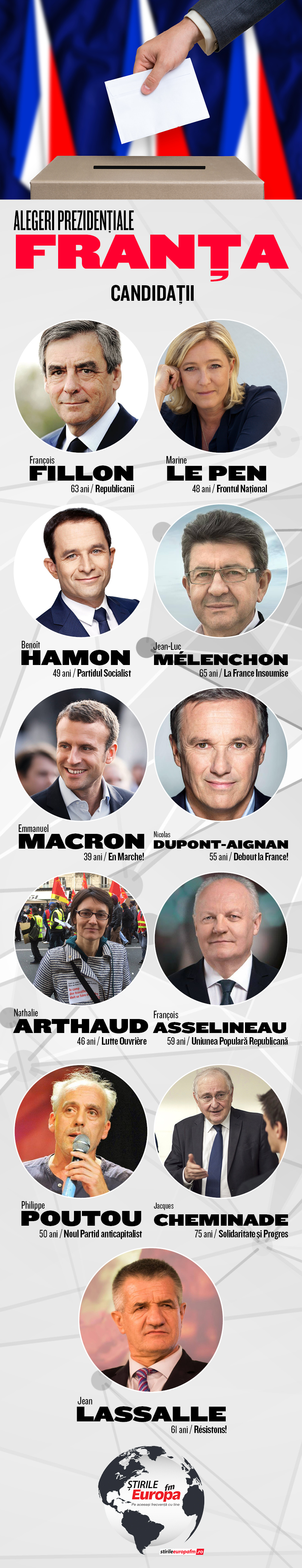 11 candidați aspiră la funcția de președinte al Franței, deținută acum Francois Hollande. Este pentru prima dată în mulți ani când nici un candidat al dreptei sau stângii este cotat cu șanse reale pentru turul doi. Cele mai recente sondaje îi dau câștigători ai primului tur pe extremista Marine Le Pen și independentul Emmanuel Macron.
