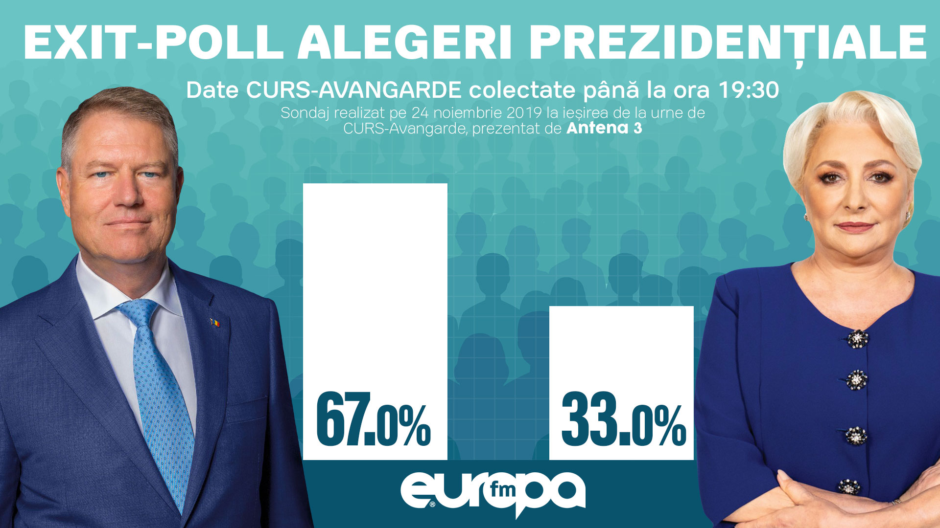 Duminică, Europa FM prezintă datele în timp real privind prezența la vot atât în buletinele sale de știri cât și pe europafm.ro, iar de la ora 21:00, Alice Iacobescu, Cristian Tudor Popescu, Moise Guran şi Vlad Petreanu vă invită pe frecvențele Europa FM și video live pe pagina de Facebook Europa FM pentru o Ediție Specială Ştirile Europa FM dededicată celui de-AL DOILEA TUR DE SCRUTIN AL ALEGERILOR PREZIDENȚIALE 2019.