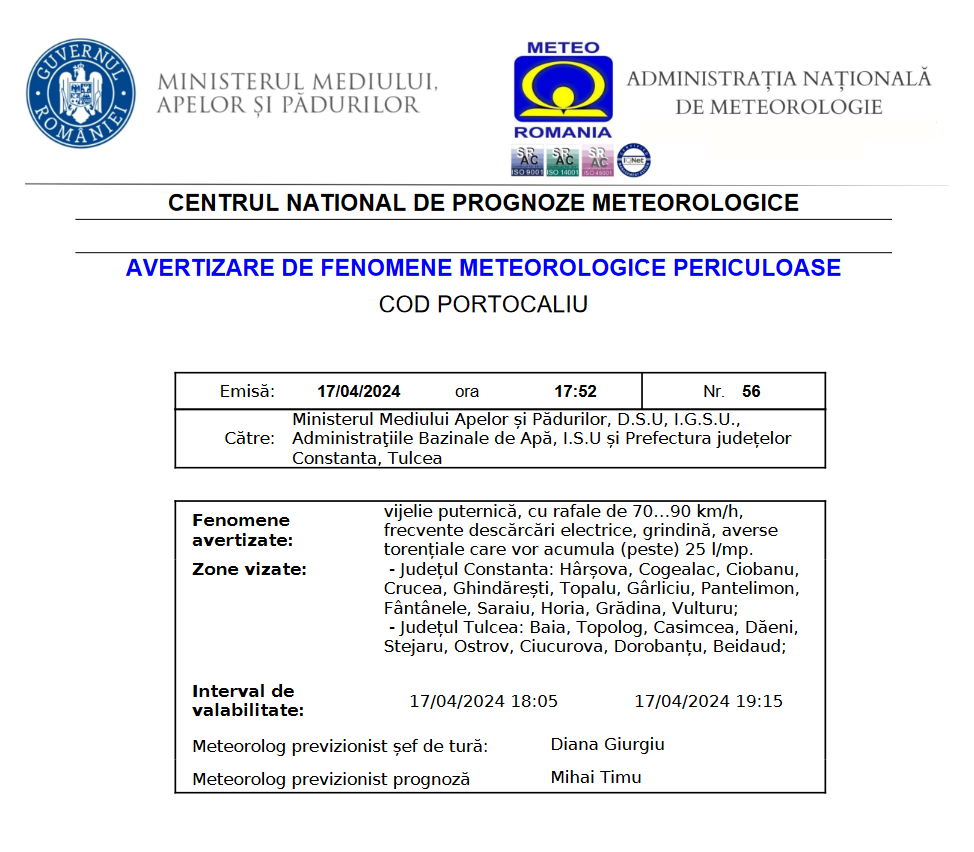Cod portocaliu de vijelie puternică, cu rafale de 70-90 de kilometri pe oră, frecvente descărcări electrice, grindină, averse torențiale care vor acumula peste 25 de litri pe metrul pătrat.