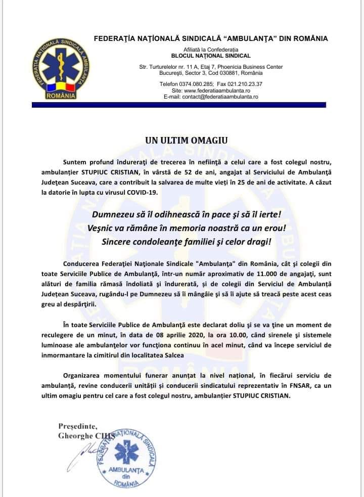 ”Dumnezeu să-l odihnească în pace şi să îl ierte. Veşnic va rămâne în memoria noastră ca un erou”, a transmis Federaţia Naţională Sindicală ”Ambulanţa”.