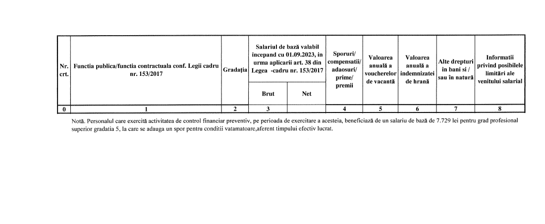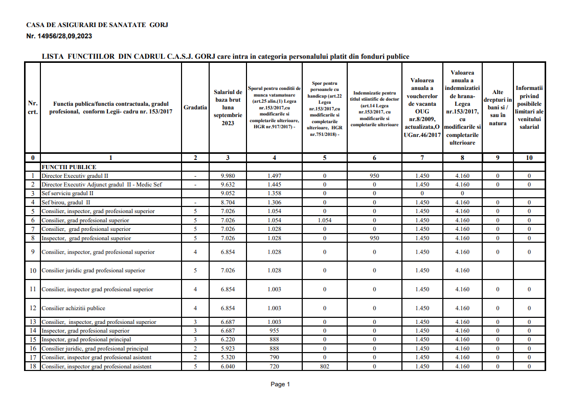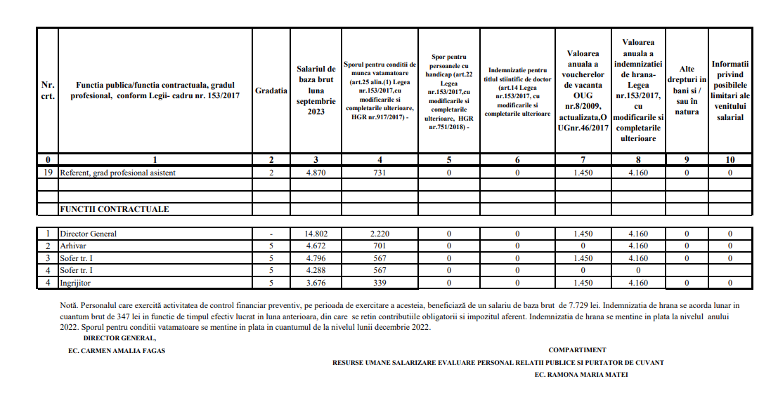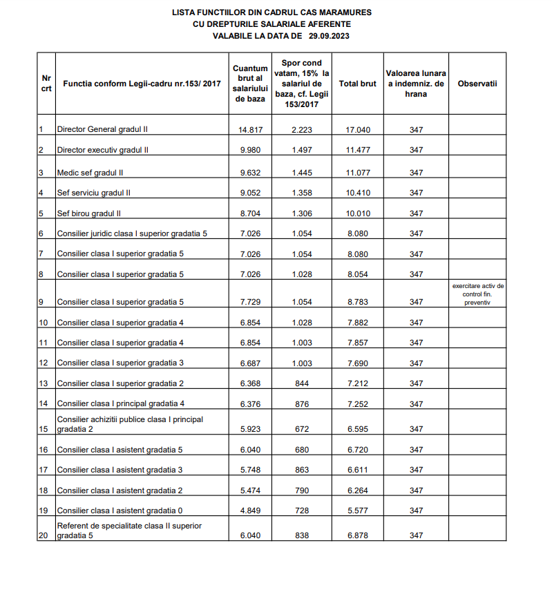 Lista funcțiilor din cadrul CAS Maramureș cu drepturile salariale aferente valabile la data de 29.09.2023