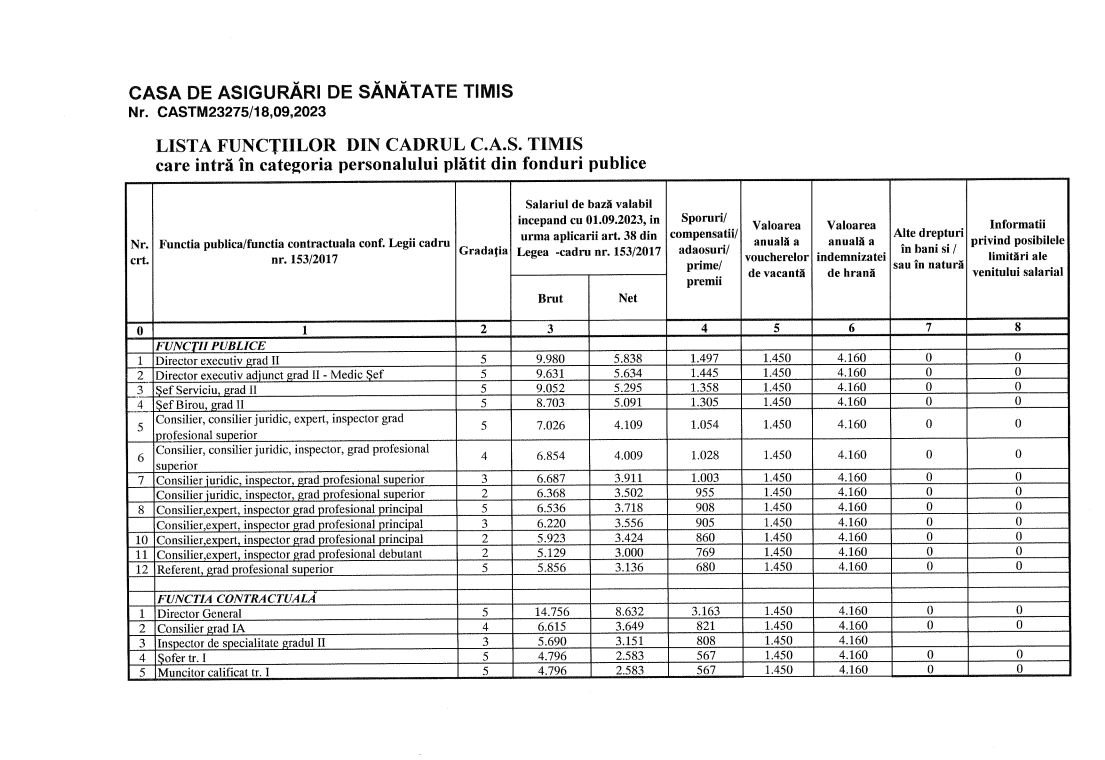 Lista funcțiilor din cadrul CAS Timiș care intră în categoria personalului plătit din fonduri publice