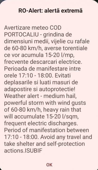 Se vor semnala: Vijelie puternică, viteza vântului la rafală de peste 90 km/h,grindină de mari dimensiuni (peste 4 cm), averse torențiale (20…40 l/mp), frecvente descărcări electrice. Codul roșu pentru județele Ialomița și Călărași este valabil joi după-amiază, până la ora 18:50.