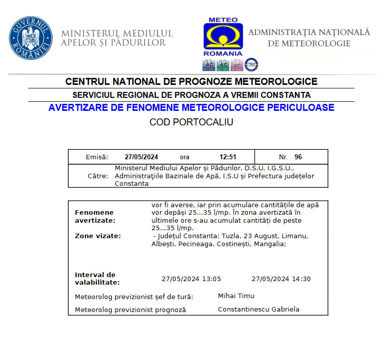 Cod portocaliu de ploi în județul Constanța, anunță Administrația Națională de Meteorologie. 7 localități sunt vizate. Avertizarea este valabilă de la 13:05 până la 14:30.