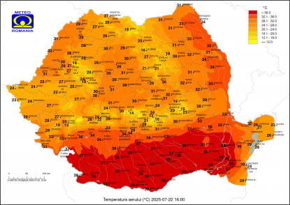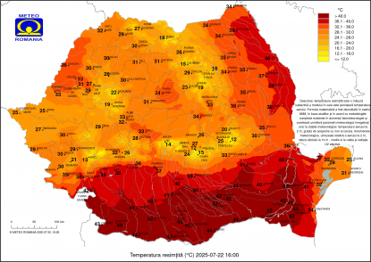 La ora 16:00, în Capitală s-au înregistrat 40 de grade Celsius, dar temperatura resimțită a depășit 44 de grade, potrivit meteorologilor ANM. La Alexandria, la aceeași oră, temperatura aerului a fost de 39 de grade Celsius, iar cea resimțită a fost de 44 de grade.