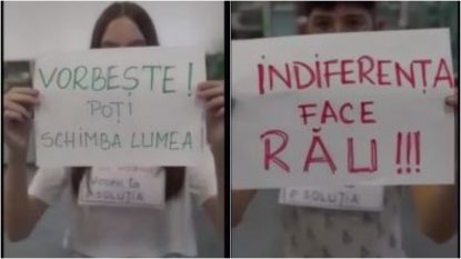 În timp ce poartă măști pe gură și în mâini au pancarte pe care scrie „Indiferența face rău”, „Vorbește, poți schimba lumea”, „Solidaritatea învinge frica” sau „Un cuvânt bun poate salva o viață”, mai mulți copii spun separat cuvânt cu cuvânt mesajul lor, iar apoi, în cor.