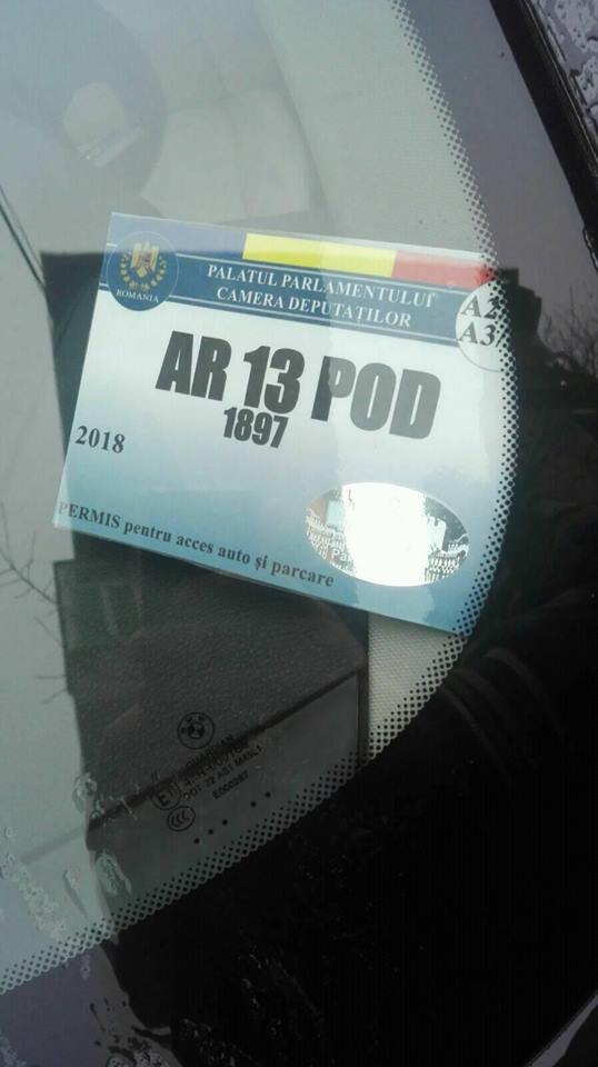 În fotografii se vede că pe bordul mașinii se află un ecoson pentru acces auto și parcare eliberat pentru anul 2018 de Camera Deputaților, pentru numărul de înmatriculare AR13POD.