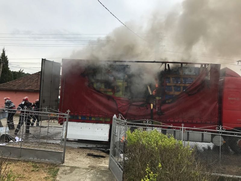 ARAD: Un TIR încărcat cu aparate de aer condiţionat a luat foc în trafic