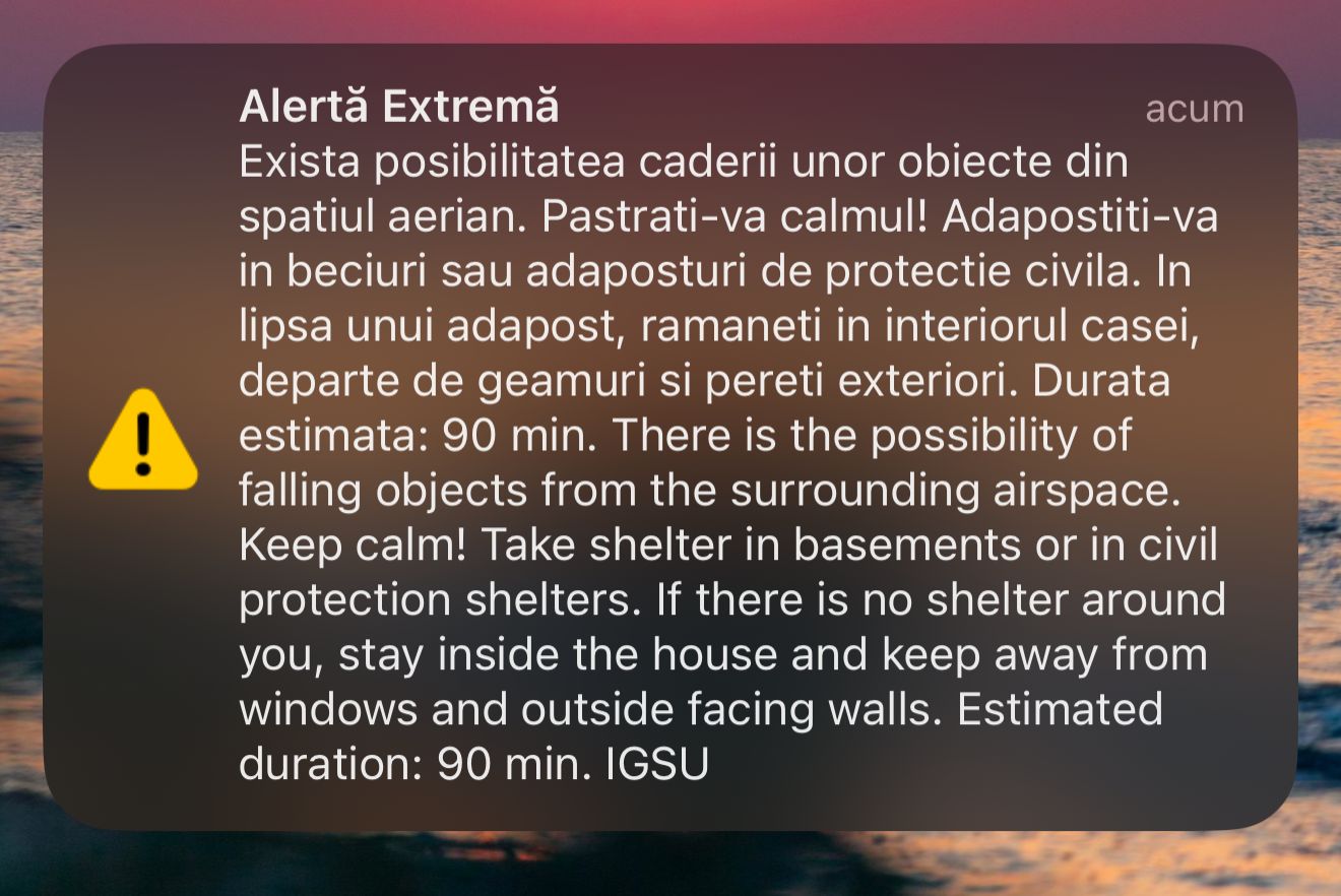 Daniel Năstase, purtător de cuvânt ISU Tulcea: „Posibilitatea căderii unor obiecte din spațiul aerian în zona de graniță a României cu Ucraina. Avertizarea a fost transmisă în urma infornațiilor primite din partea Ministerului Apărării Naționale”.