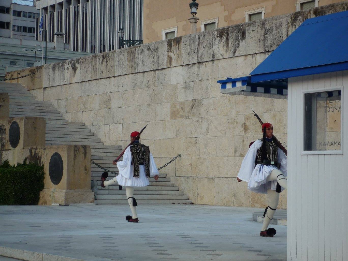 Tot în piața Syntagma, centrul Atenei, este clădirea Parlamentului. La fiecare oră, are loc ritualul schimbării gărzilor Evzones, ușor de recunoscut datorită costumelor tradiționale pe care le poartă.