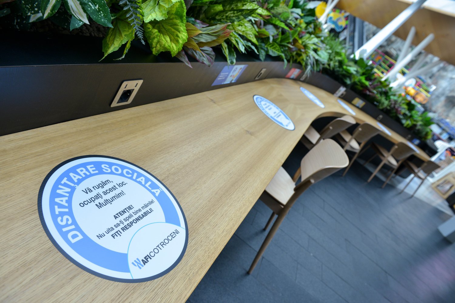 AFI Cotroceni și AFI Ploiești vor fi igienizate permanent, mai ales pe zonele de contact – balustrade, butoane și clanțe, iar clienții vor fi informați să folosească dezinfectantele pentru mâini puse la dispoziție pe fiecare culoar și în zona de mese, cât și să evite zonele aglomerate.