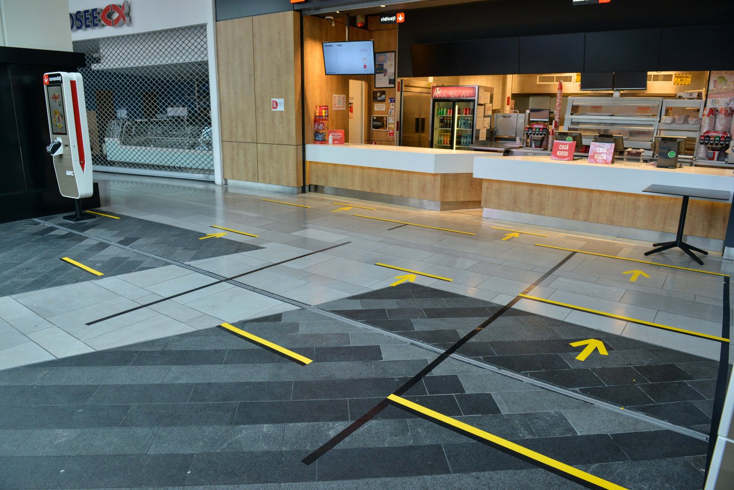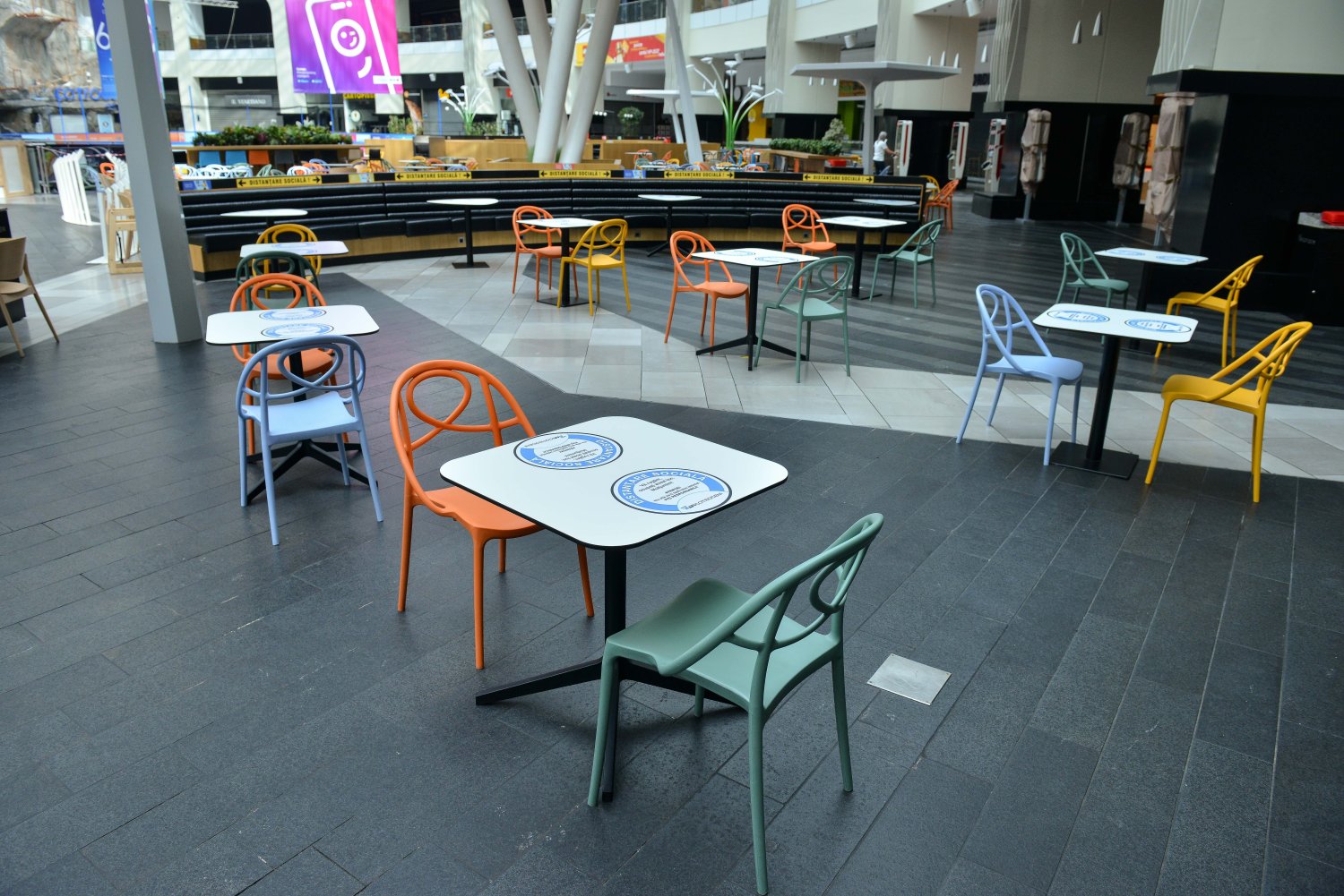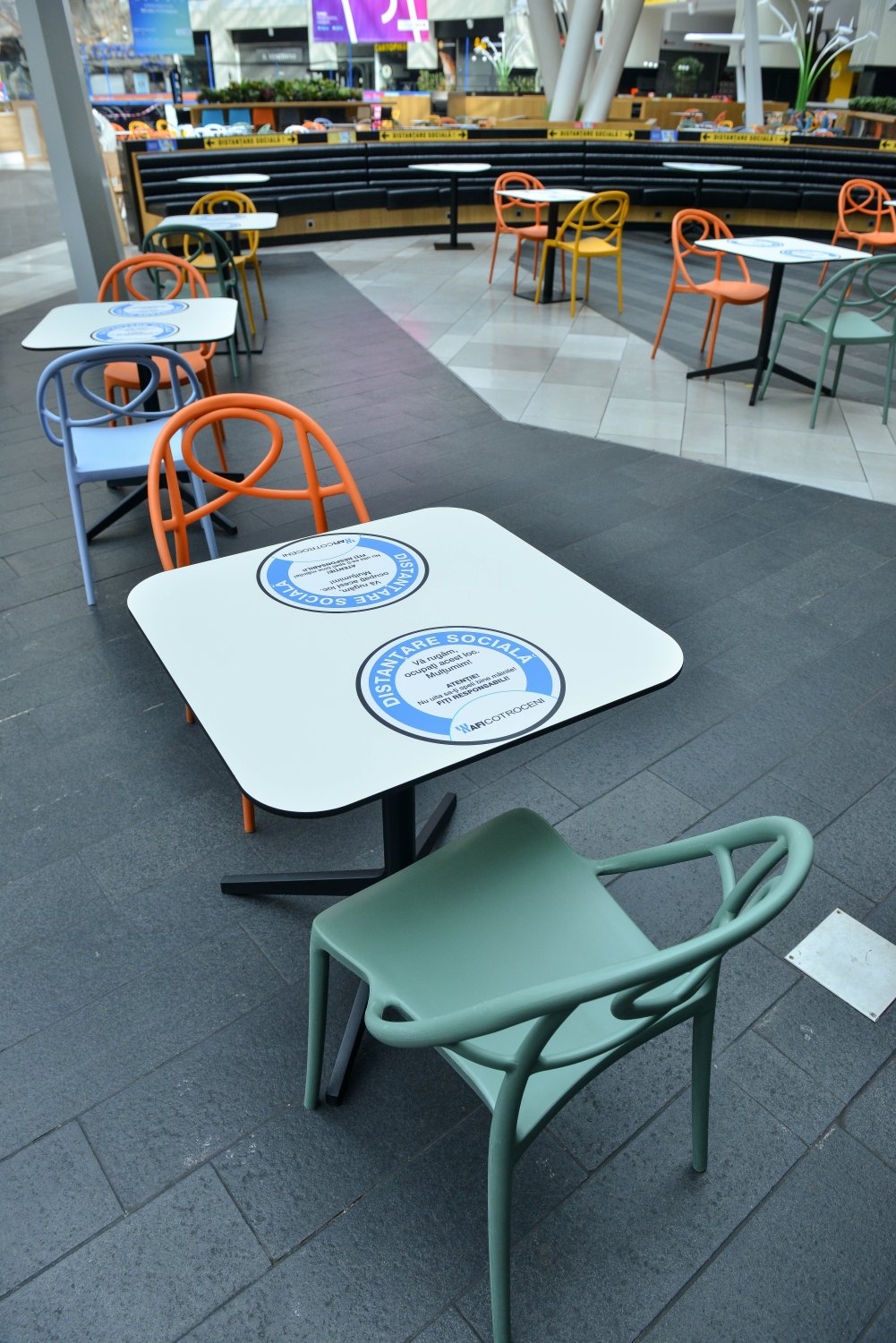 O altă regulă importantă este cea a distanțării sociale de 2 metri, care va fi aplicată prin lipirea de stickere pe podea la această distanță, pentru a-i atenționa pe oameni să nu depășească zona de siguranță, mai ales când așteaptă în fața unui magazin sau la coadă, la casă. În lifturi vor intra doar 2 oameni odată, iar în foodcourt vor fi instalate pe mese stickere de atenționare, iar mesele și scaunele vor fi într-un număr mai mic și la distanță corespunzătoare.