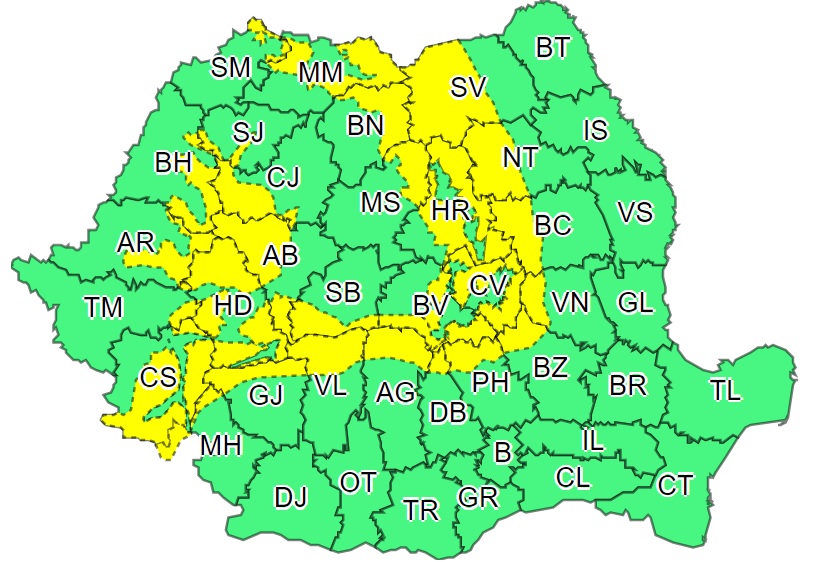 Codul Portocaliu vizează județele Satu Mare, Maramureș, Sălaj, Suceava, Bistrița-Năsăud, Neamț, Harghita, Mureș, Brașov, Covasna, Prahova, Dâmbovița, Argeș, Vâlcea, Mehedinți, Gorj, Sibiu, Alba, Cluj, Bihor, Arad, Timiș, Caraș Severin, Hunedoara, Bacău, Vrancea și Buzău.