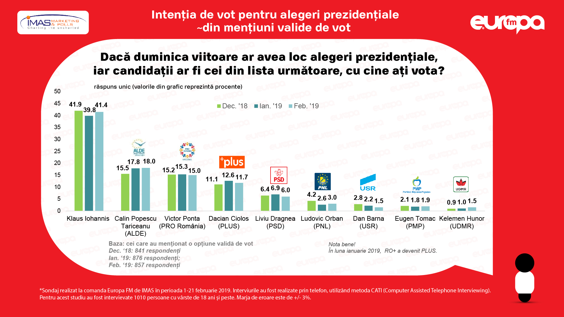 Sondajul a fost realizat de IMAS la comanda Europa FM pe un eșantion de 1010 persoane cu vârste de 18ani și peste, în perioada 1-21 februarie 2019. Interviurile au fost realizate prin telefon,utilizând metoda CATI (Computer Assisted Telephone Interviewing). Marja de eroare este de +/- 3%. Eşantionul este probabilist, multistratificat, cu extragere aleatoare a persoanei.