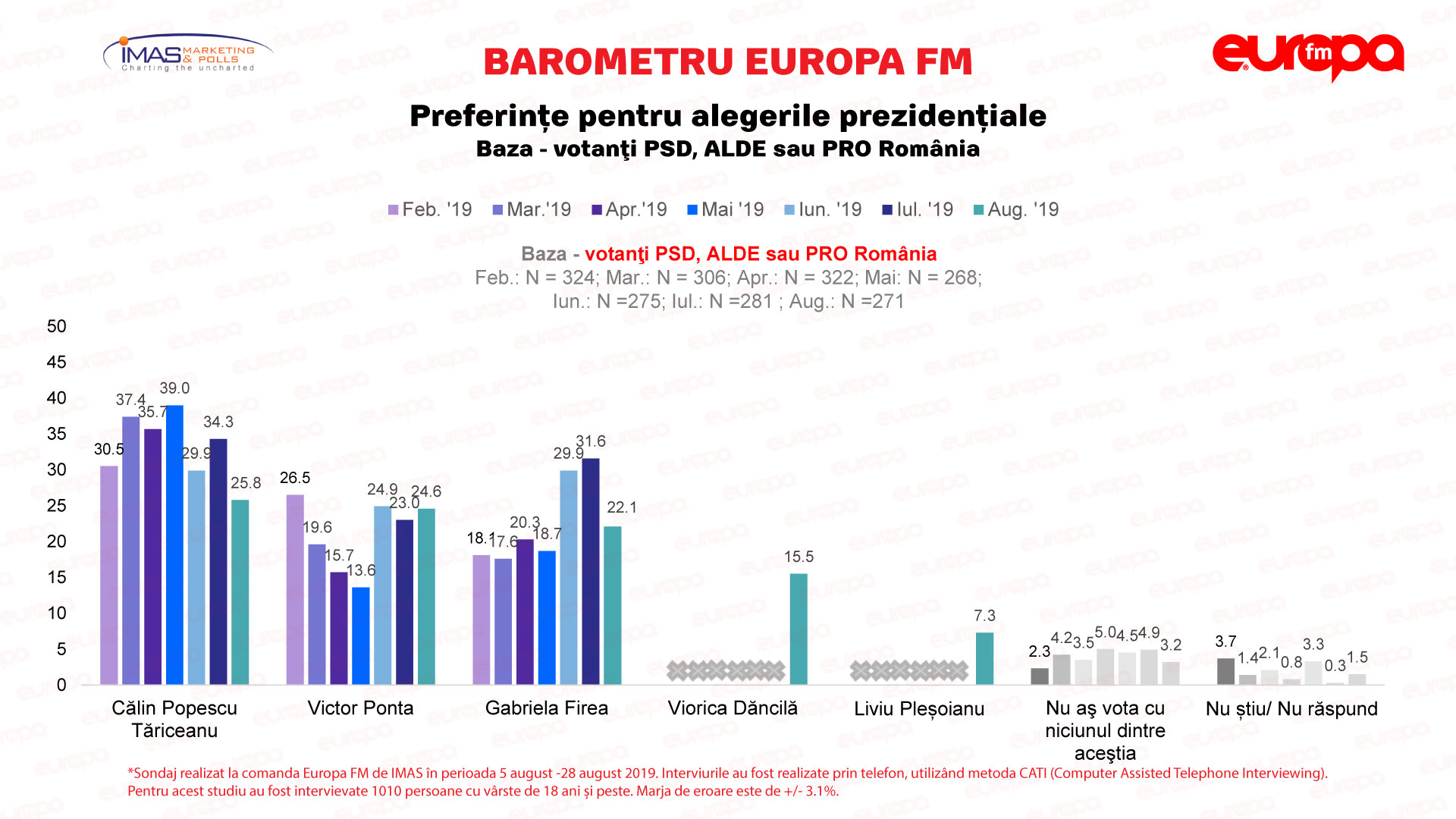 Pe parcursul acestui an, IMAS realizează Barometru Europa FM, la comanda postului nostru de radio, pentru a urmări intențiile de vot ale românilor pentru partide și potențialii candidați la alegerile prezidențiale 2019, dar și pentru a analiza impactul unor politici publice sau decizii importante pentru societatea românească. Cel mai recent Barometru Europa FM a fost făcut public la finalul săptămâni trecute și cuprinde datele aferente sondajului realizat pe parcursul lunii august.