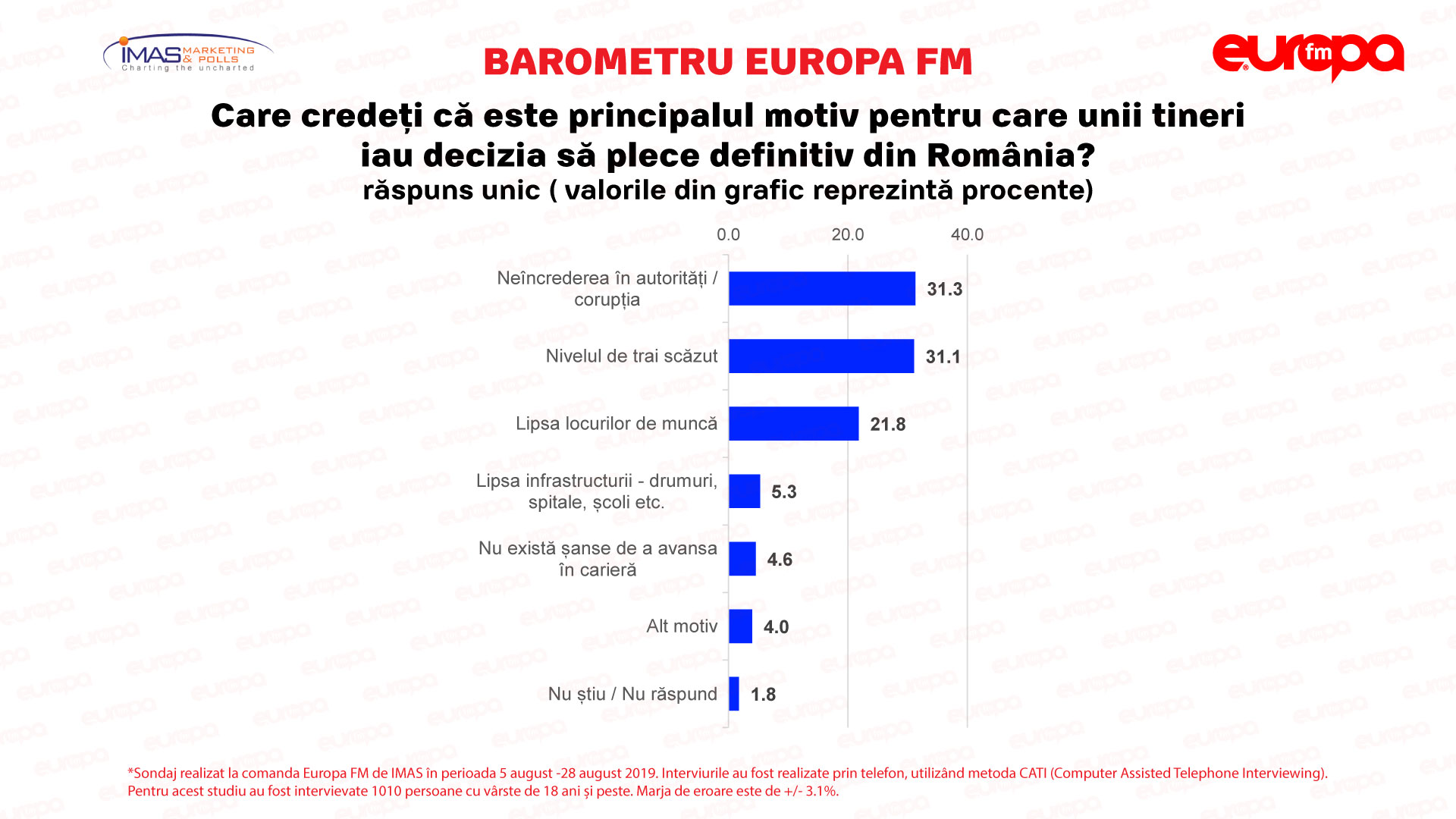 Barometru Europa FM, realizat de IMAS, la comanda postului de radio Europa FM, a căutat să afle care este percepția publică asupra motivelor pentru care unii tineri aleg să părăsească România.