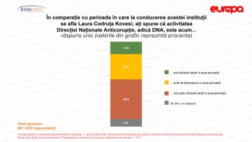 În ceea ce privește comparația cu perioada în care DNA era condusă de Laura Codruța Kovesi, 46,8 la sută dintre români sunt de părere că activitatea DNA este mai puțin eficientă.