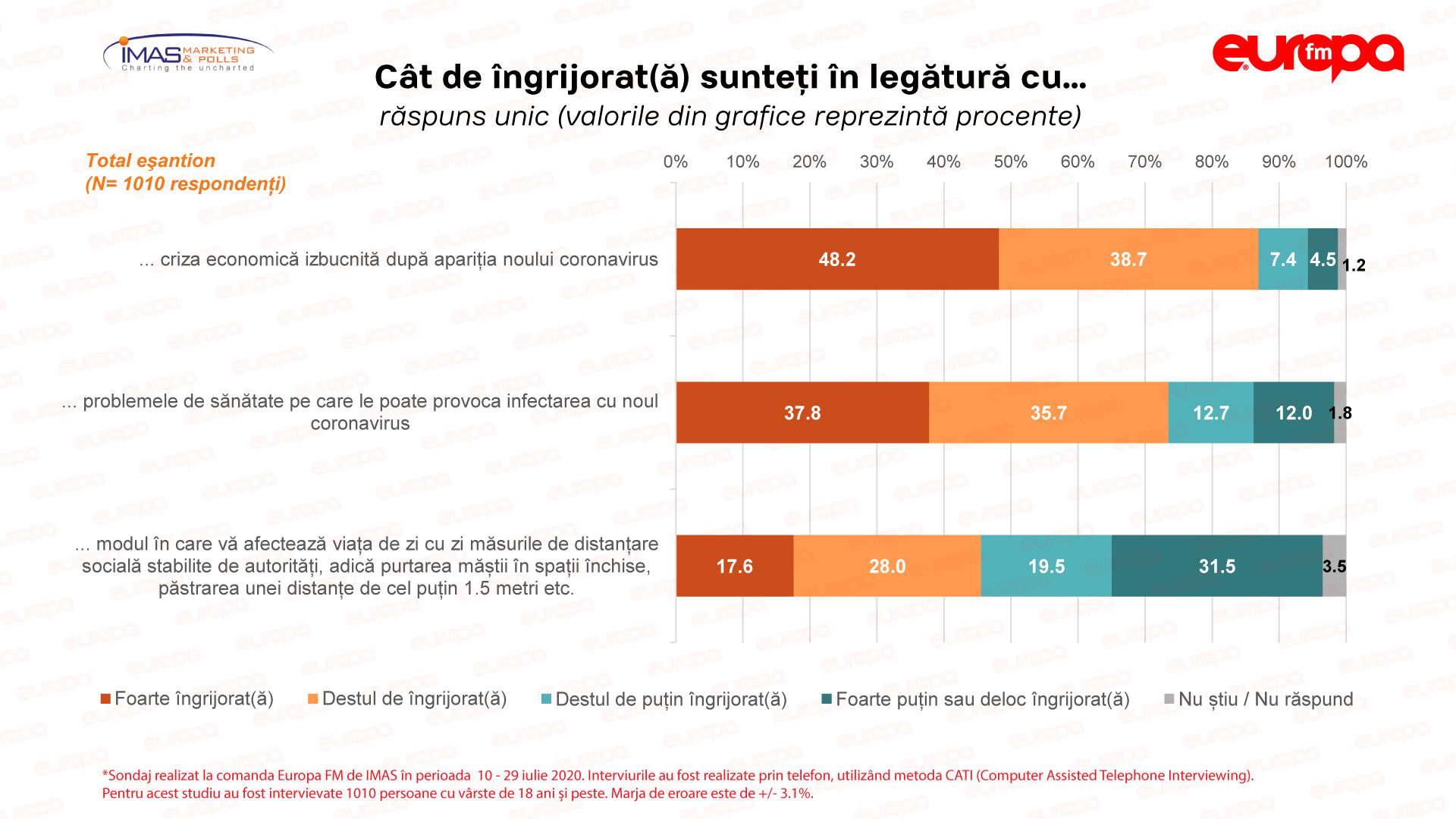 Barometrul Europa FM e realizat de IMAS în fiecare lună, începând din ianuarie 2019. Sondajul reflectă opinia publicului pe teme politice, dar și pe subiecte de larg interes care variază de la o perioada la alta. Din martie 2020, o parte a sondajului este dedicată întrebărilor specifice legate de criza coronavirus și impactul asupra vieții de zi cu zi.