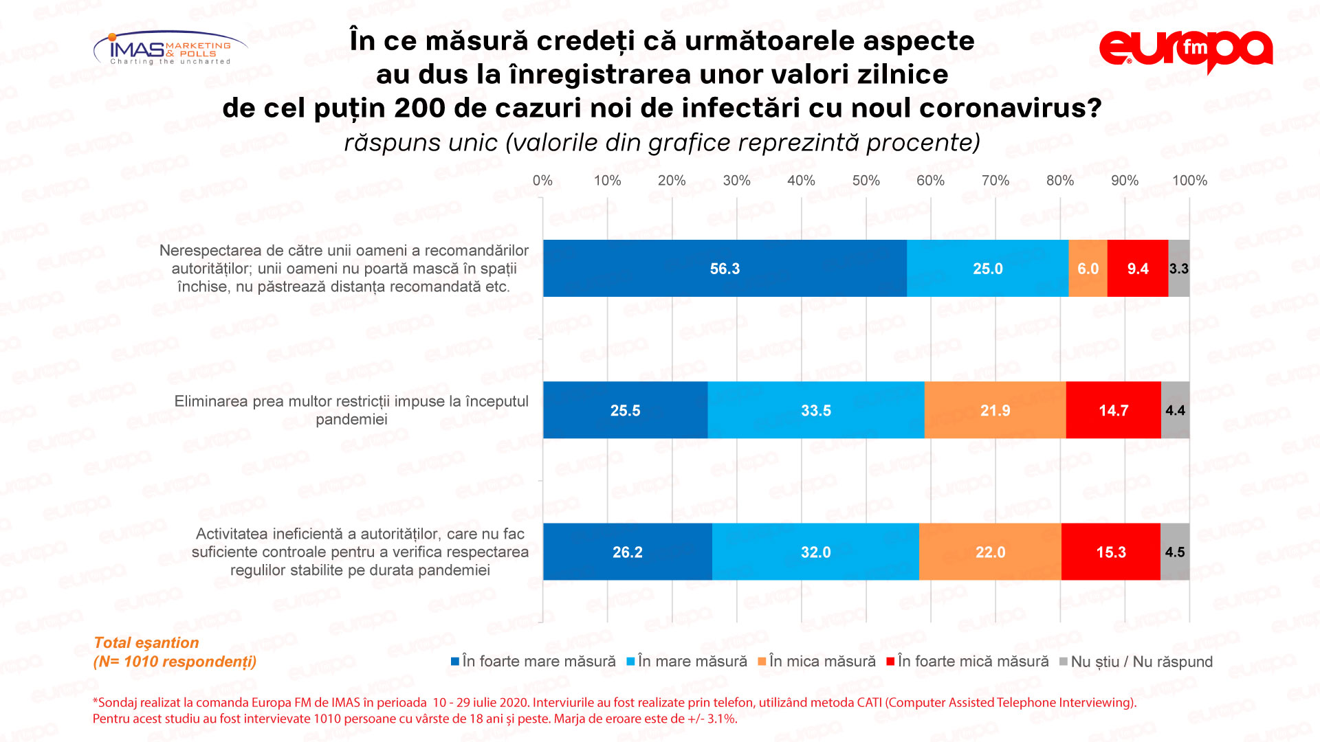 Potrivit sondajului realizat de IMAS, vina pentru agravarea situației o au atât cetățenii care nu poartă masca și nu respectă distanțarea, cât și autoritățile care nu sunt capabile să sancționeze aceste abateri, dar s-au grăbit să elimine prea multe dintre restricțiile inițiale.