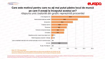 În ceea ce privește motivul schimbării sau pierderii locului de muncă, aproape un sfert dintre cei chestionați spun că a fost alegerea lor. Pe locul al doilea se află restructurarea totală sau parțială cu 16 la sută. Urmează șomajul tehnic, cu 13 la sută, creșterea copilului cu 10 la sută, pensionarea cu 9,5 la sută, falimentul companiei cu 8 la sută și concedierea cu 7,8 la sută.