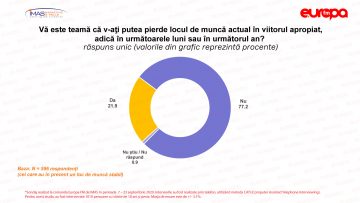 Barometrul Europa FM mai arată că românii sunt în general încrezători că își vor păstra actualele locuri de muncă. Astfel, 77 la sută dintre cei care au acum un loc de muncă stabil nu se tem că își vor pierde joburile în următoarele luni sau în următorul an.
