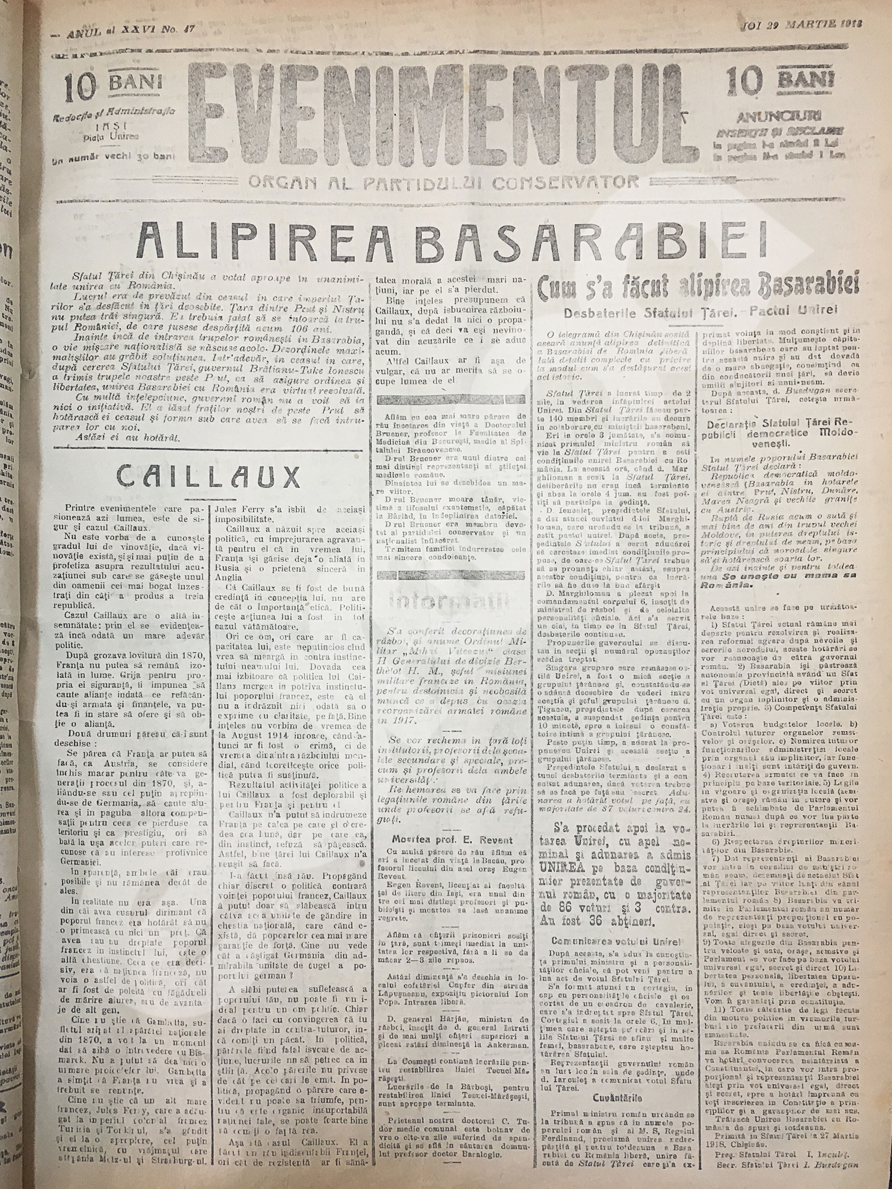 Evenimentul de Iaşi, 29 martie 1918 despre unirea Basarabiei cu România