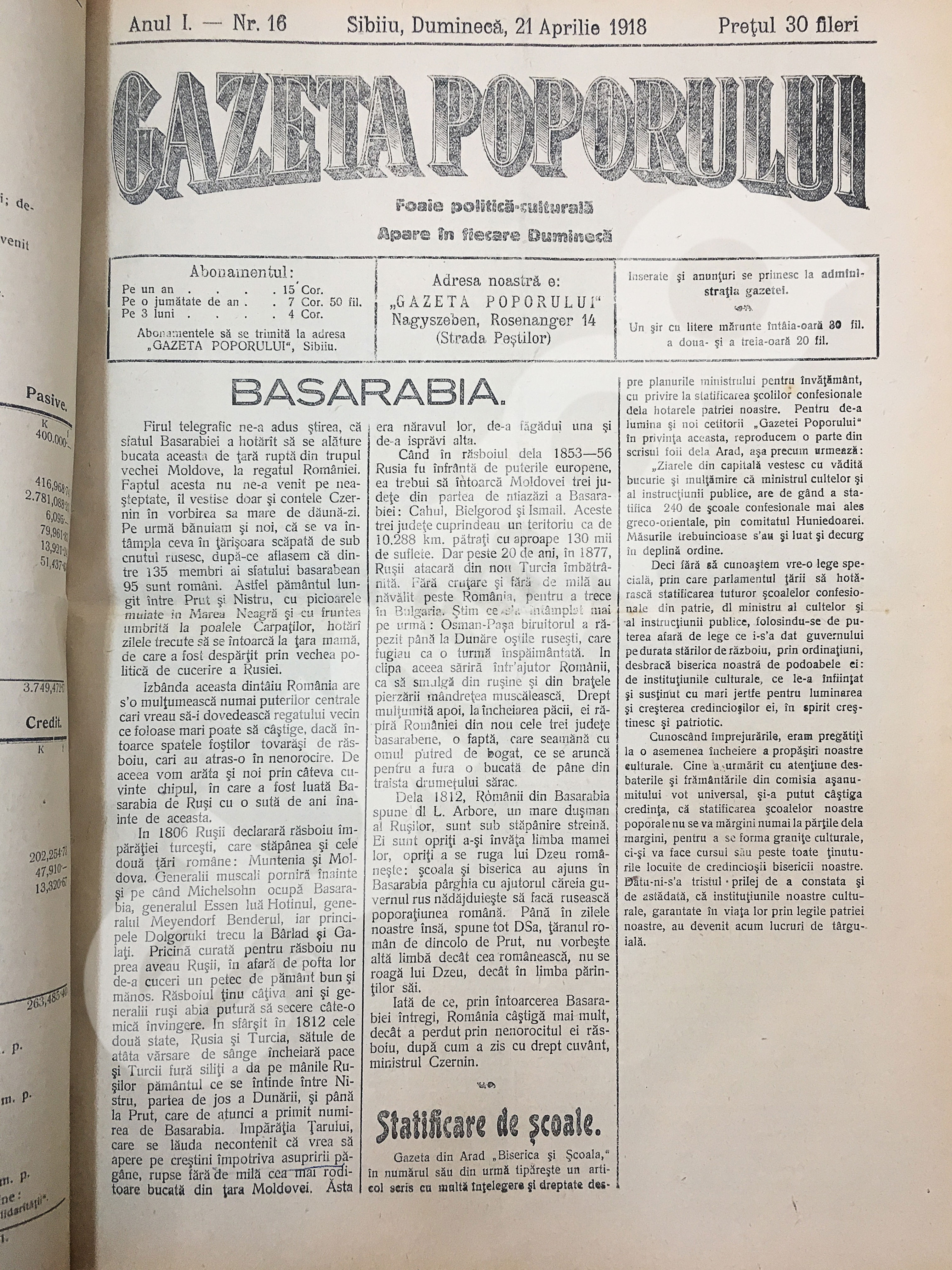 Gazeta Poporului, 21 aprilie 1918 despre unirea Basarabiei cu România