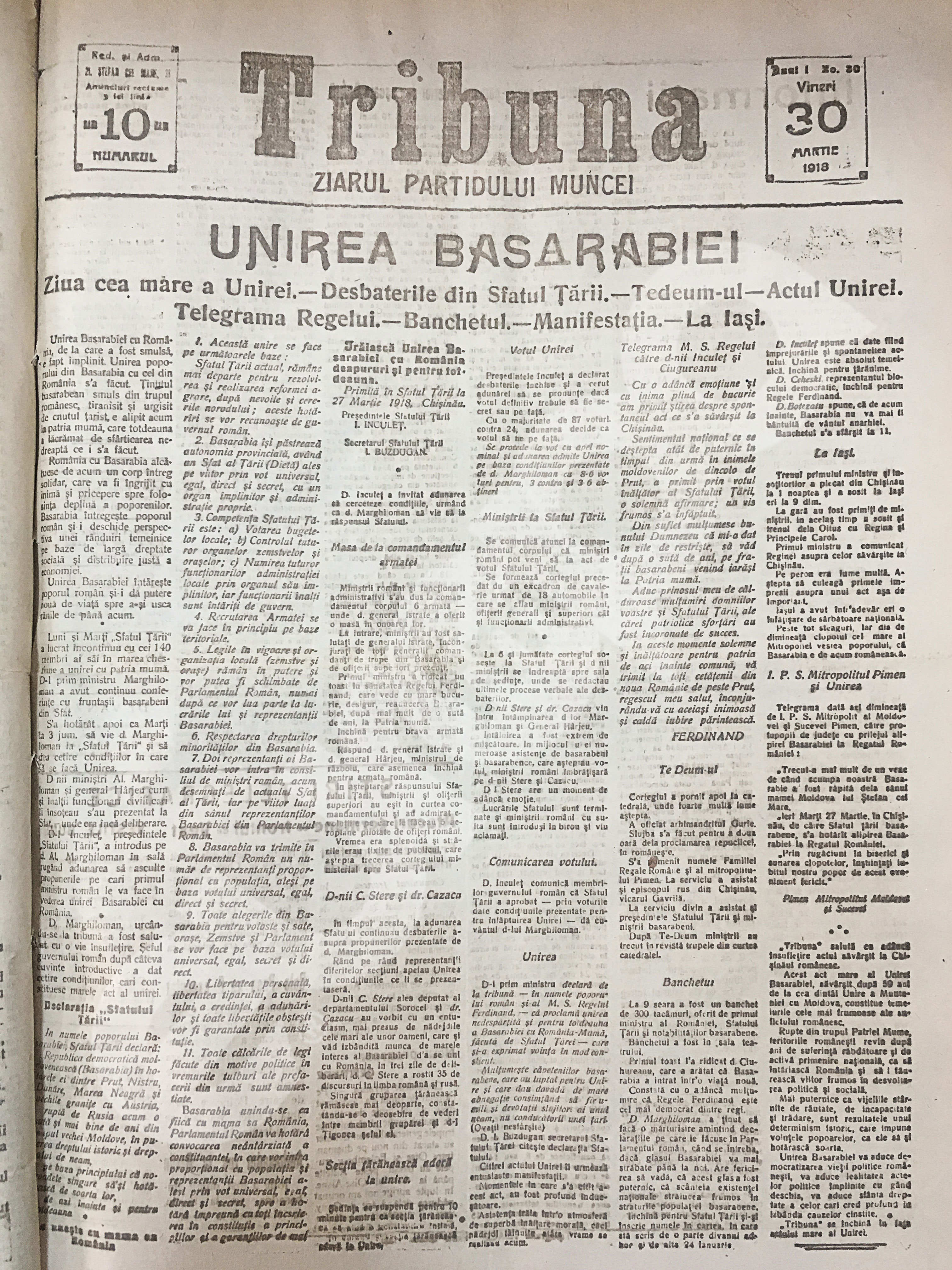 Tribuna, 30 martie 1918 despre unirea Basarabiei cu România