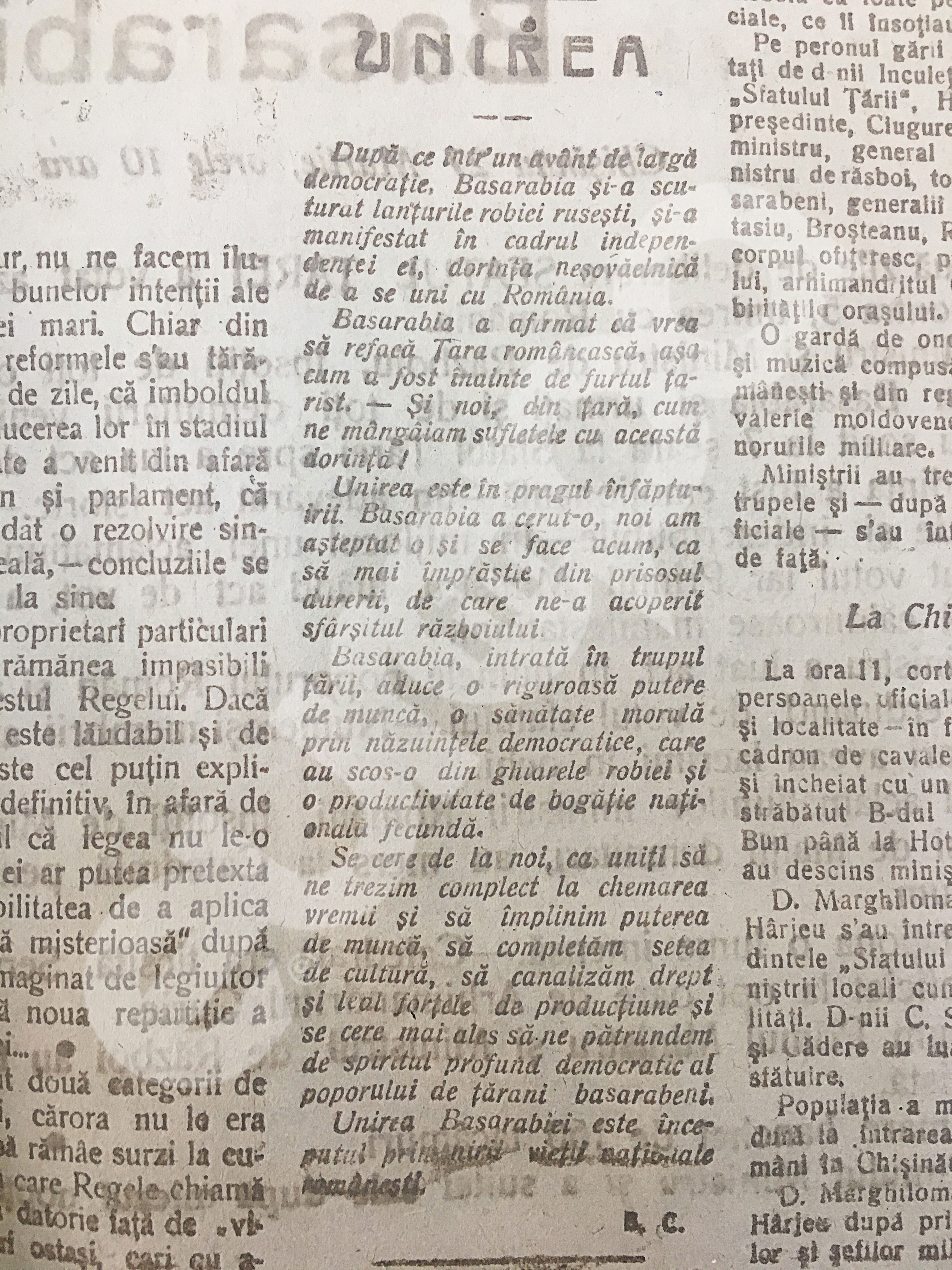 “După două zile de deliberare Sfatul Ţărei a votat astăzi, cu 86 contra 3, unirea cu România. Primul Ministru şi Ministrul de război, însoţiţi de toţi ofiţerii superiori din Basarabia, şi urmaţi şi de demnitarii veniţi în Kişinău, au sosit la ora 7 seara la Sfatul Ţărei, spre a lua act de votul dat.