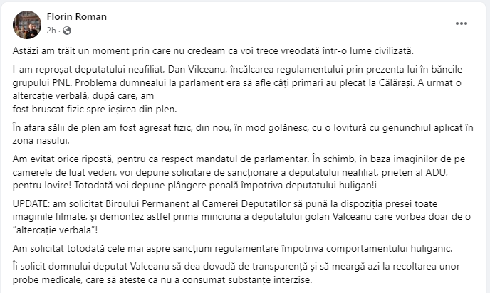 Florin Roman a scris pe Facebook: „Astăzi am trăit un moment prin care nu credeam ca voi trece vreodată într-o lume civilizată. I-am reproșat deputatului neafiliat, Dan Vilceanu, încălcarea regulamentului prin prezenta lui în băncile grupului PNL. Problema dumnealui la parlament era să afle câți primari au plecat la Călărași. A urmat o altercație verbală, după care, am fost bruscat fizic spre ieșirea din plen. În afara sălii de plen am fost agresat fizic, din nou, în mod golănesc, cu o lovitură cu genunchiul aplicat în zona nasului.