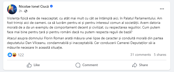 Nicolae Ciucă a transmis, prin Facebook, un mesaj în care arată, citez: „Violența fizică este de neacceptat, cu atât mai mult cu cât se întâmplă aici, în Palatul Parlamentului. Am fost trimiși aici de oameni, ca să lucrăm pentru ei (…). Avem datoria morală de a da un exemplu de comportament decent și civilizat”.
